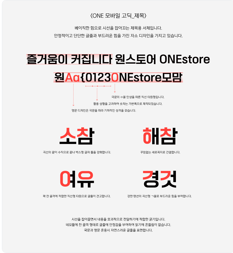 이 폰트의 가장 큰 특징은 모바일 환경에 최적화된 가독성과 함께 원스토어만의 독특한 개성을 담고 있다는 점입니다. 특히 온라인 프로모션, 이벤트 포스터, SNS 콘텐츠 등에 사용하면 시선을 사로잡는 효과를 얻을 수 있습니다.